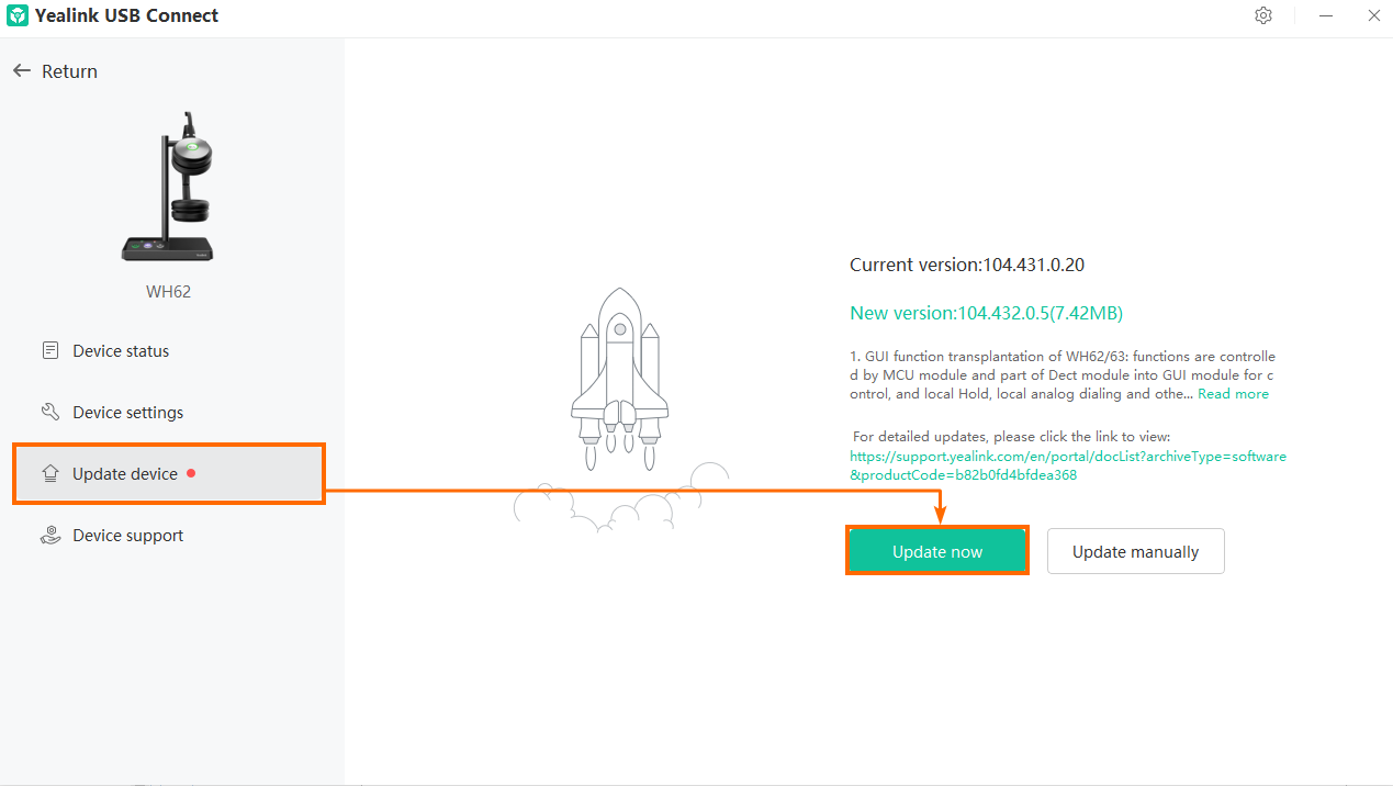 Note: if you have several Headsets connected make sure to click on the one with the correct serial number. You can check the serial number on the sticker at the bottom of the base. - Go to Update device. If there is an update available click on Update now to install it. The update could take up to 5 minutes.