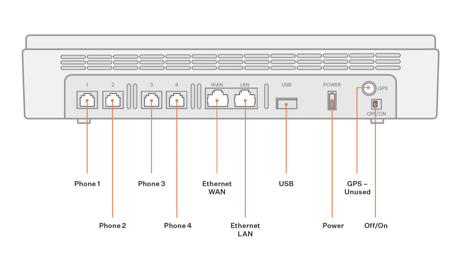 Phone 1-4: Connect to your telephony devices using an RJ11 wire. Ports must be activated by GazelleTel Support (monthly fees apply).